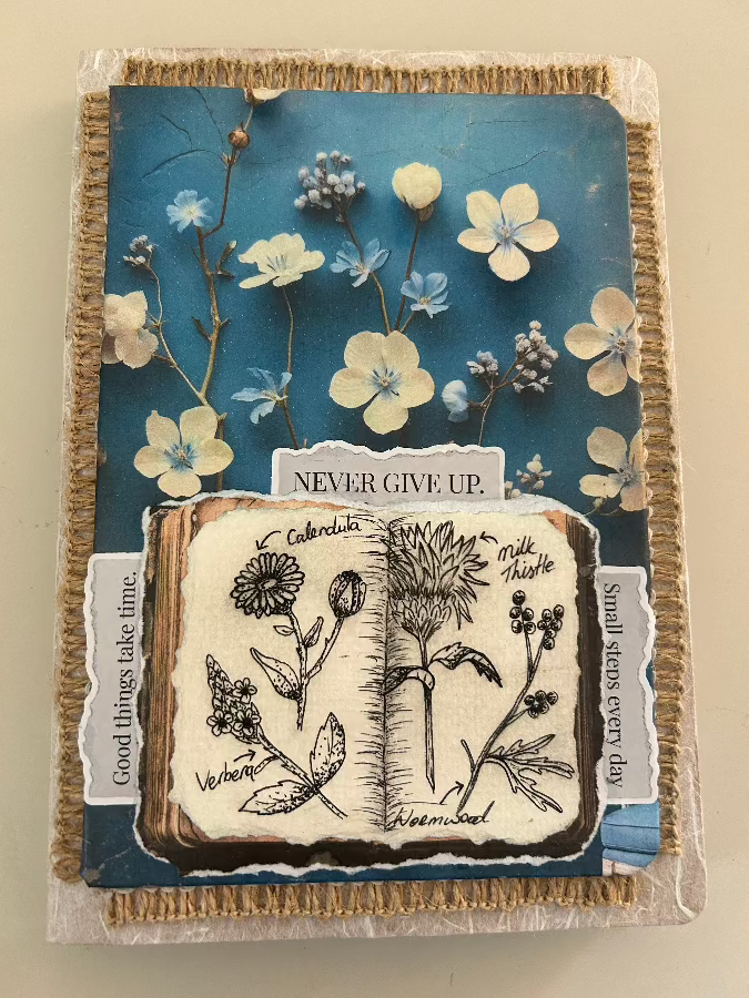 Cover: Cardstock, paper, ink, handmade paper, jute ribbon. Sealed with beeswax.